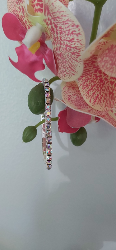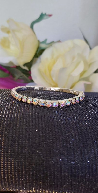 Multicolour, rainbow effect rhinestone elastic bracelet set in silver metal. Single layer rhinestones